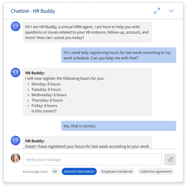 Den allmänna chatboten minskar behovet av manuell support för anställda och chefer, samtidigt som den säkerställer en effektivare användarupplevelse.